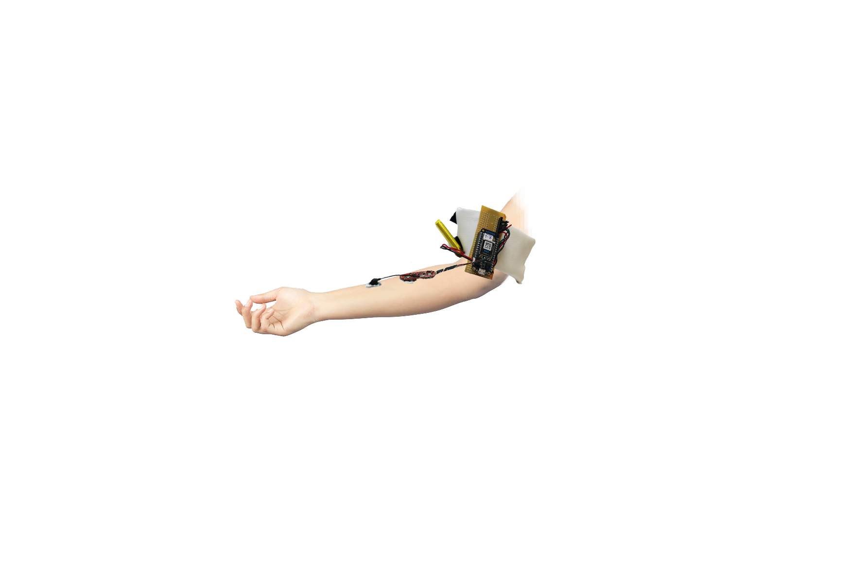 Highlighting the potentials for muscle sensor usage, I created a completely wearable device that would attach to the arm and visually affect the real-time (Kinect) webcam image using a Particle API attached to a JSON client for Processing Script, and a lithium battery. The flexion of the full arm (from the wrist and the forearm pulling in towards the body) widens the visual threshold of red throughout the webcam video, and the opposite pull away from the body with the forearm decreases the red surface area. The muscles in the wearer's body mitigates moving image results.